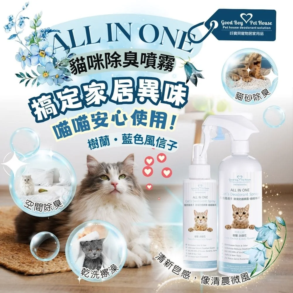 ALL IN ONE 法國香氛貓咪除臭防護噴霧 這款 貓咪寵物除臭噴霧 含有貓咪費洛蒙,用來貓砂除臭、噴在不小心便溺的床上、吐毛球的地板、還有需要除貓便便的任何地方。花香系列讓貓咪也喜歡,更喜歡接近他便溺的廁所喔~環境無壓力,排便更順暢。一瓶多用途,還可以用來清潔貓皇屁屁,非常乾淨衛生喔!五款香氛的香氣都非常清新好聞,除了貓咪之外,狗狗也可以用喔!