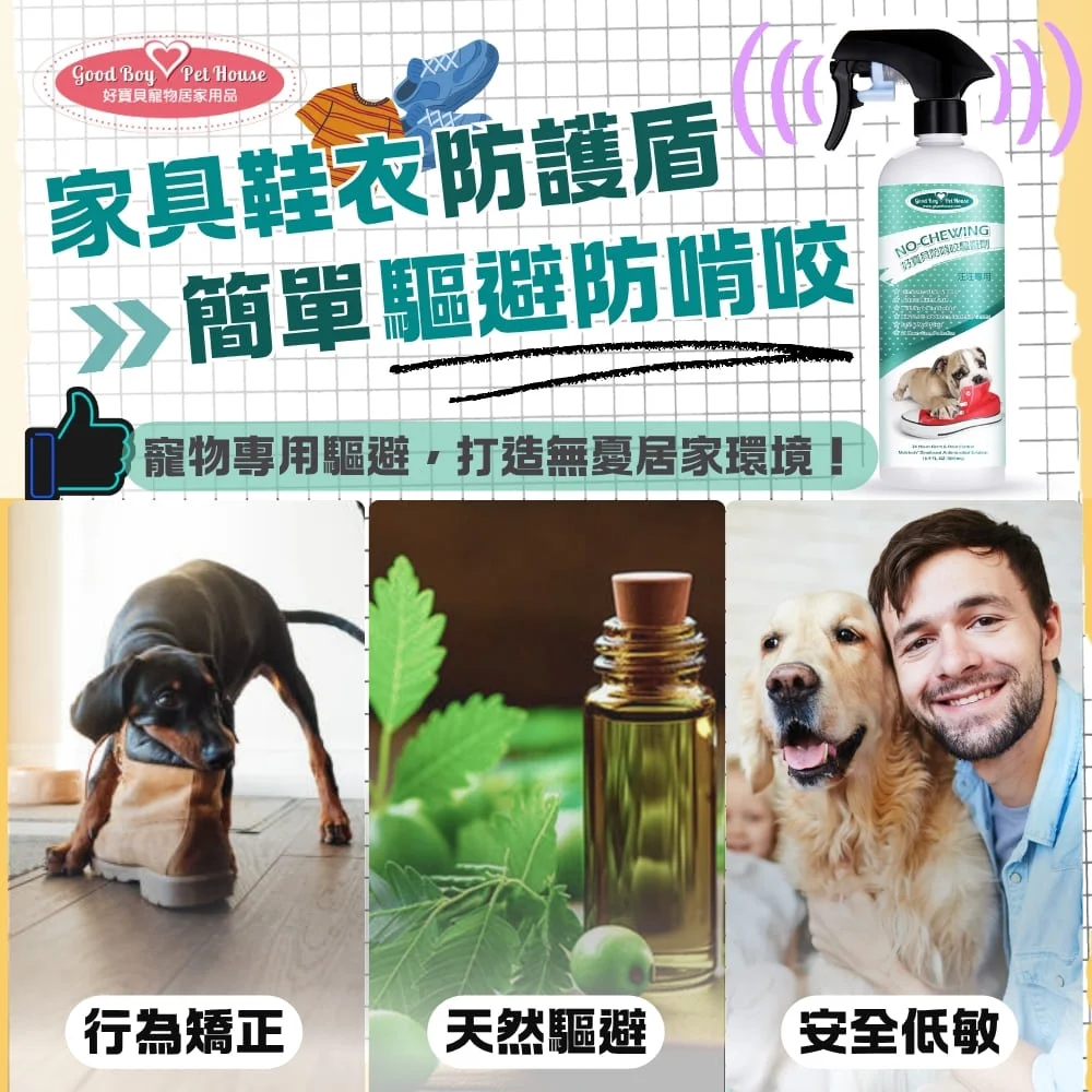 狗狗防啃咬驅避劑 汪汪專用忌避劑 是專門為愛亂咬亂啃的狗狗研發而成, 長牙齒中的幼犬特別愛磨牙, 這段時間主人必需要幫助狗狗知道哪些地方是不能啃咬的, 因為木屑還有塑膠玩具吃進肚子裡,會造成極大損傷, 還需要花大錢手術取出來。 所以防啃咬驅避劑可以忌避狗狗去啃咬一些不能啃咬的東西。 例如:拖鞋、玩具、桌腳、等等。 GBPH好寶貝 採用的精油都是純天然安全成分,所以不用擔心造成寵物的危害喔! ◆矯正汪汪不良行為輕鬆設立禁區 ◆長效型消臭防護配方效果長達7天 ◆天然苦味劑和狗狗專用驅避精油 ◆SGS無毒認證不含有害化學成分