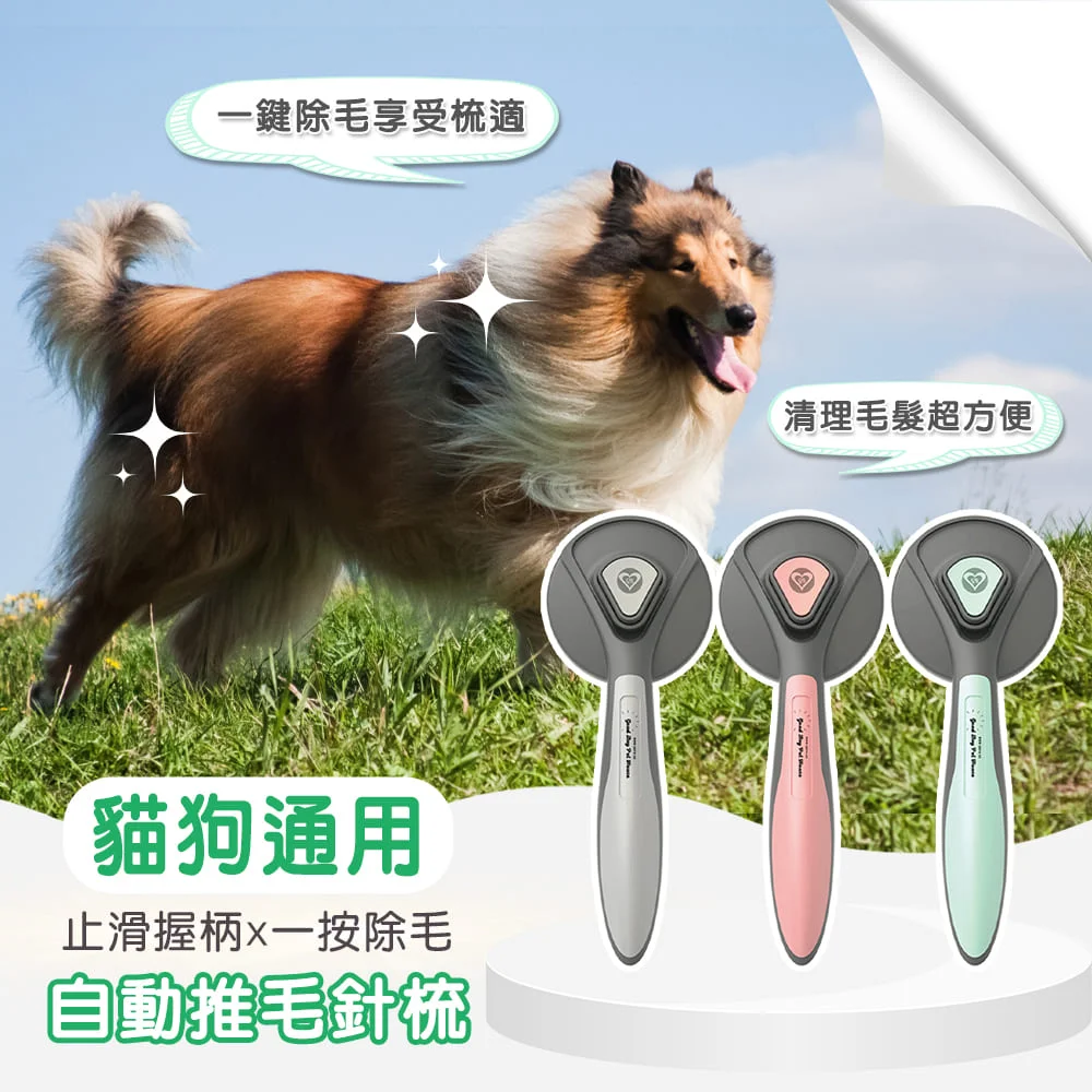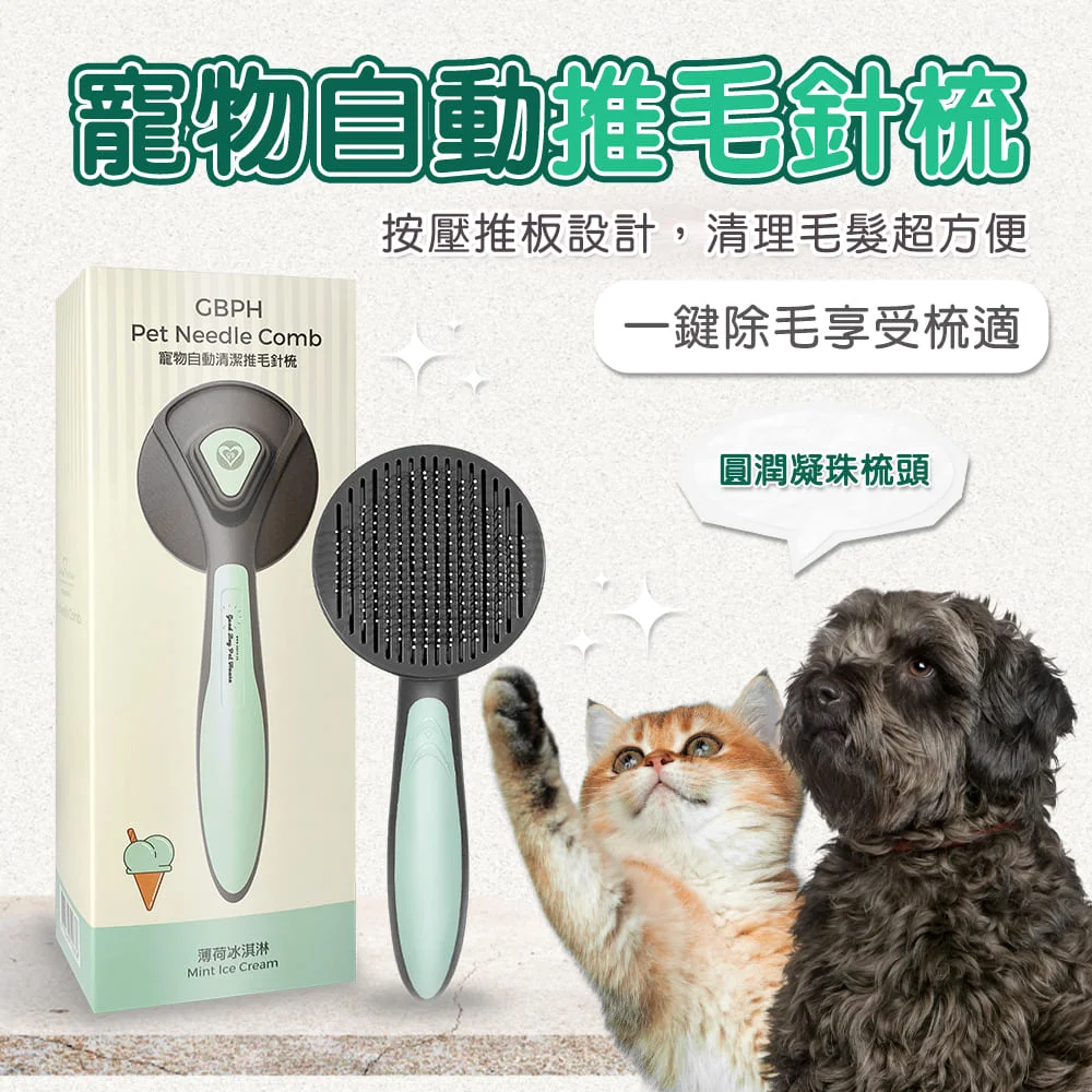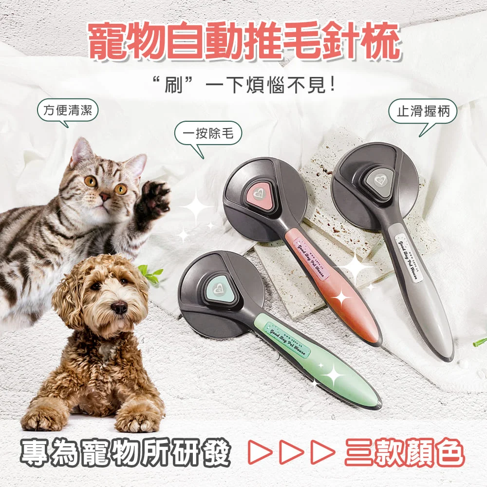 ◆一鍵除毛享受梳適 ◆按壓推板設計,清理毛髮超方便 ◆塑料材質防滑手柄,梳毛更省力 ◆圓潤凝珠梳頭,好梳不傷皮膚