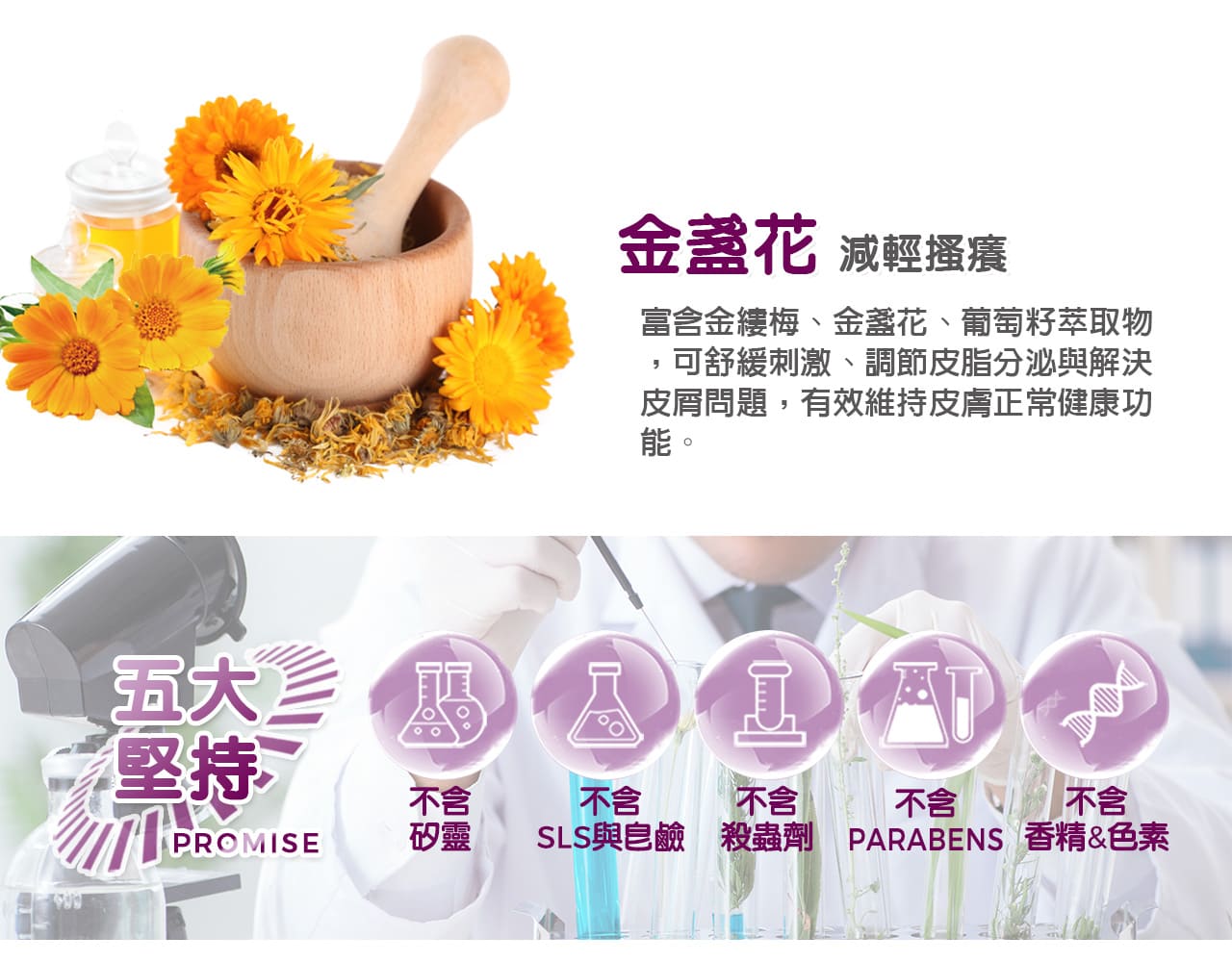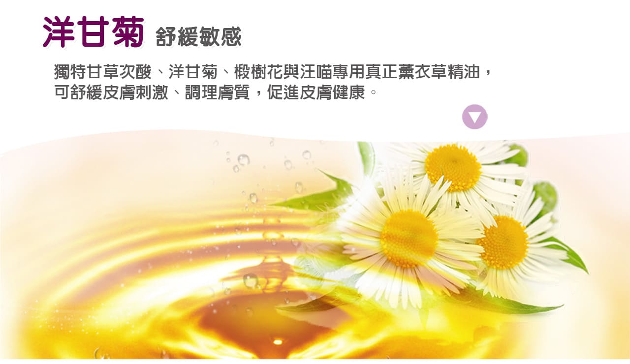 採用苦楝樹、絲蘭、甘草、洋甘菊、椴樹花萃取物,