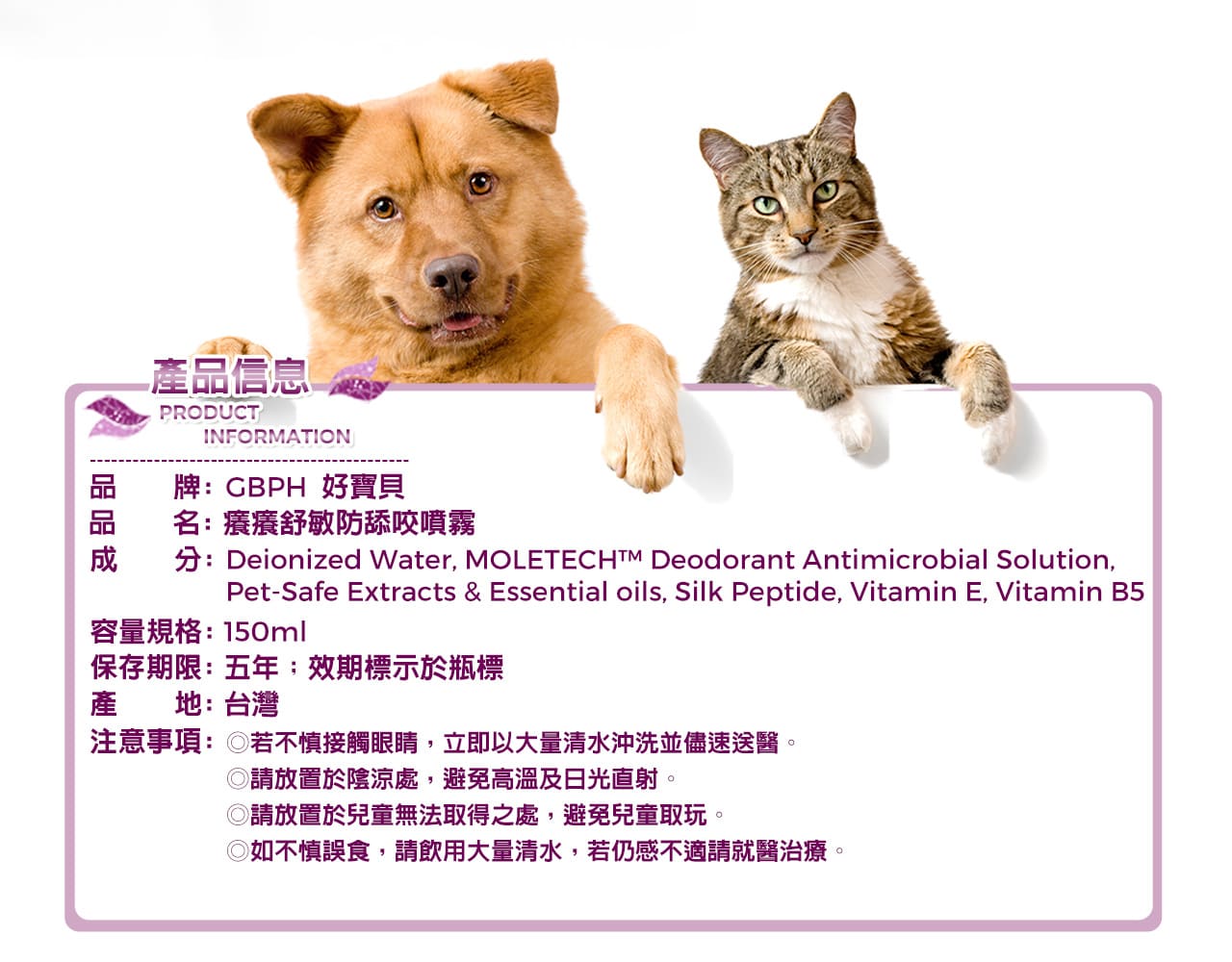 其實是因為好寶貝又不想要毛孩們吃苦,產品的確有效、搭配頭套也好很快,只是毛孩因為不喜歡身上氣味的關係,噴了之後想要除去味道。飼主們的反應我們都能理解,只是我們在毛孩吃苦的同時,我們也很於心不忍。畢竟,產品研發的初心是解決問題肌膚。 希望能在苦味與效果上取得平衡。